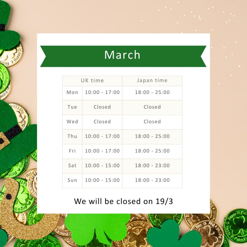 3月17日(火)がアイルランドの祝日ですが、弊社の定休日と被るため3月19日(木)がお休みとなります。日本とイギリスの祝日は営業しています。